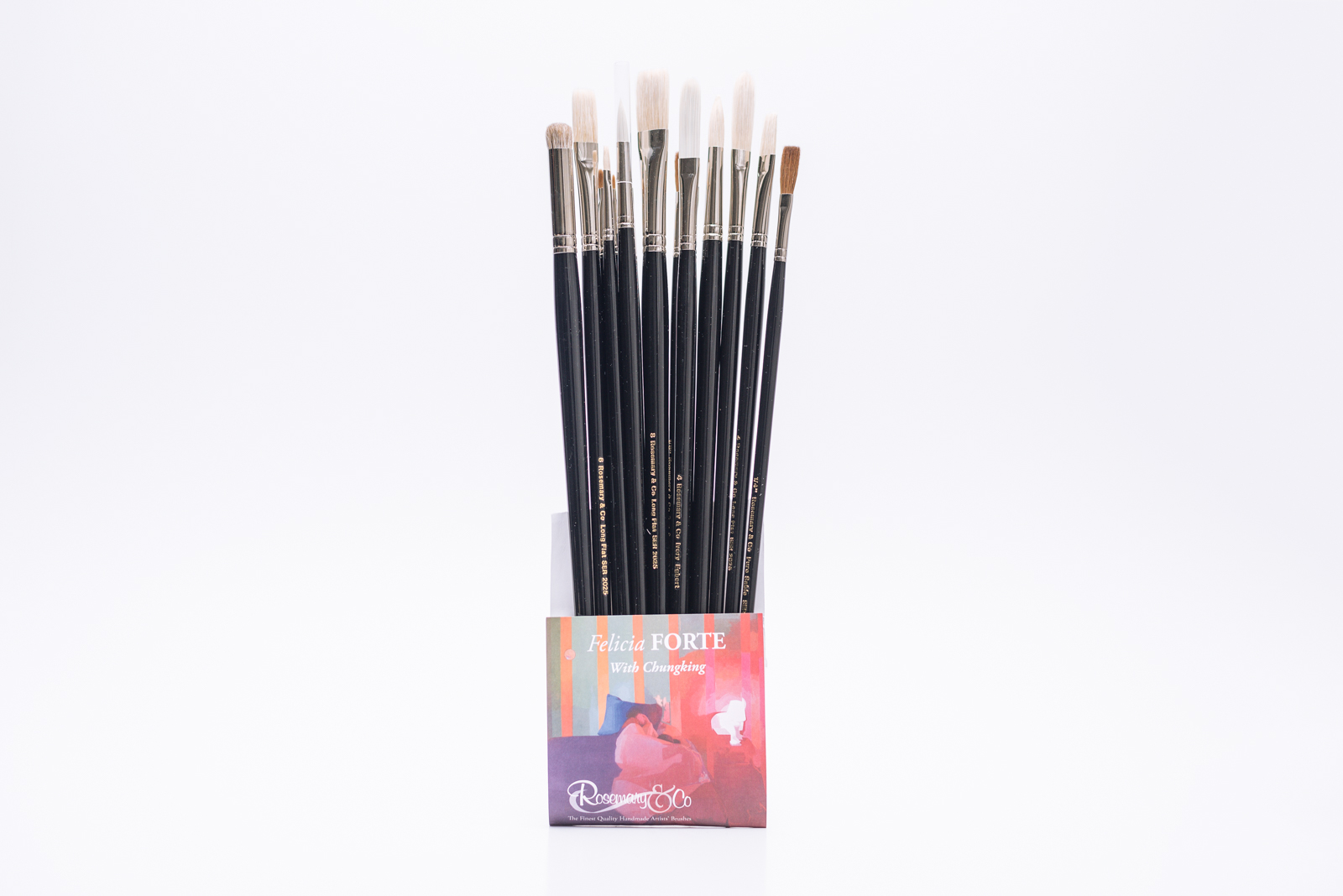 Rosemary maakt al 39 jaar penselen. Rosemary Thompson over haar merk: Ik heb het geluk dat ik door mijn beroep de wereld rond heb kunnen reizen, zowel op zoek naar materialen als naar verschillende productiestijlen. Dankzij deze bronnen vind ik mijn eigen methoden voor het maken van penselen en train ik mijn team ‘op mijn manier’. Ik heb een team van zeer bekwame penseelmakers opgeleid om dit voorbeeld te volgen.