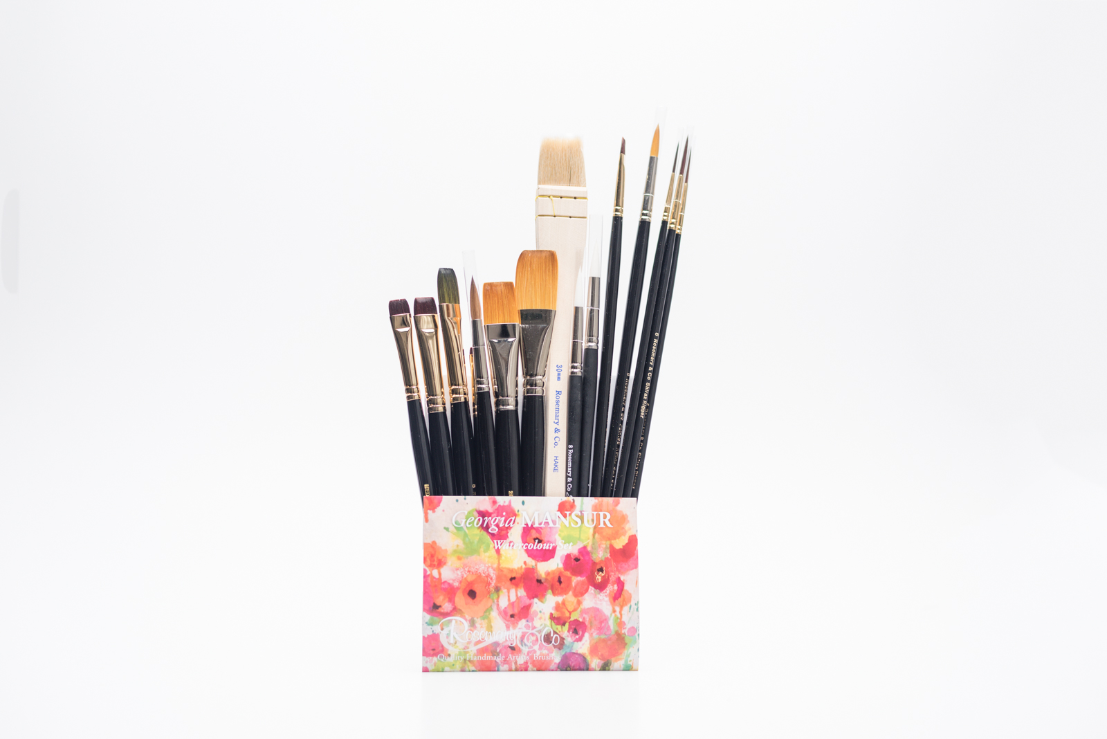 De Georgia Mansur Watercolour Set is geen standaard starterspakket — het is een bewust samengestelde professionele brushset, ontworpen voor veelzijdigheid en kwaliteit. Of je nu zachte washes maakt, verf liften toepast of vloeiende lijnen nastreeft — deze set ondersteunt intensief aquarelleren met tools die Mansur zelf gebruikt.