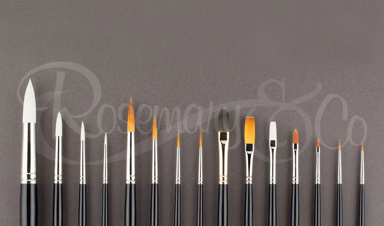 Rosemary maakt al 39 jaar penselen. Rosemary Thompson over haar merk: Ik heb het geluk dat ik door mijn beroep de wereld rond heb kunnen reizen, zowel op zoek naar materialen als naar verschillende productiestijlen. Dankzij deze bronnen vind ik mijn eigen methoden voor het maken van penselen en train ik mijn team ‘op mijn manier’. Ik heb een team van zeer bekwame penseelmakers opgeleid om dit voorbeeld te volgen.
